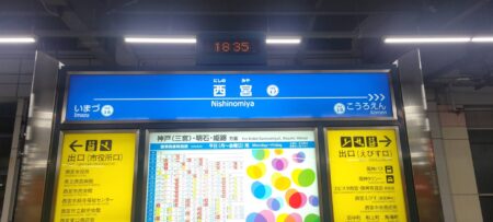 尼崎駅まで普通電車で3マス、尼崎駅から快速電車に乗り1マス
