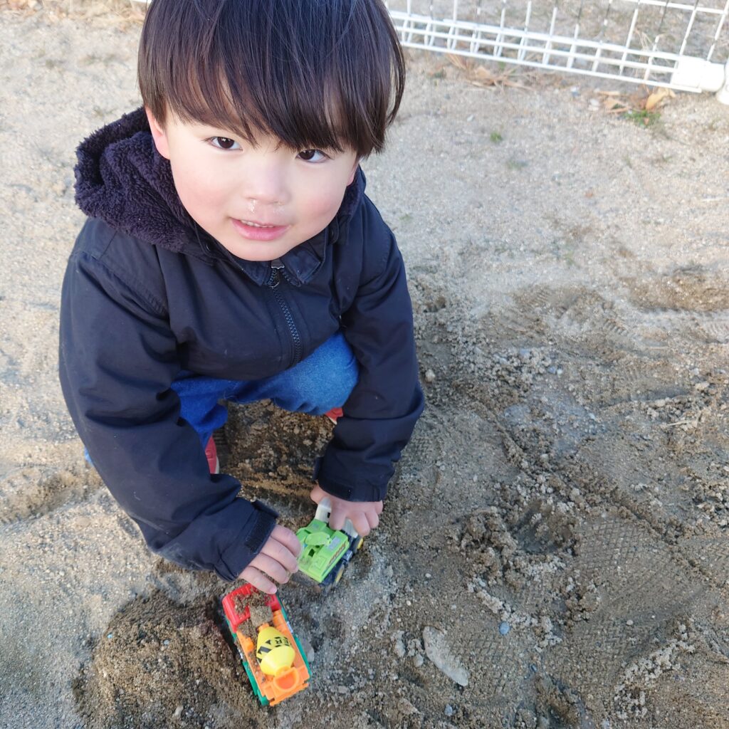 鼻水を垂らしながら、元気に建機で遊ぶ息子