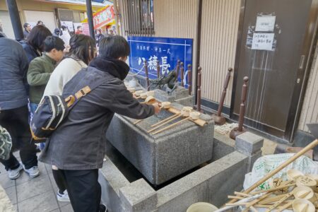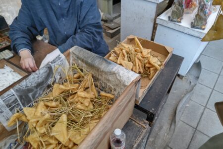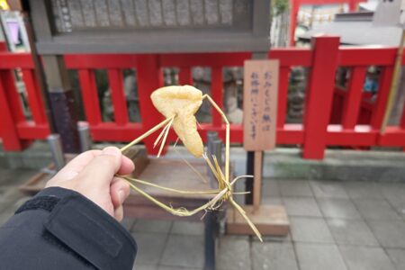 揚げと小銭を一緒に投げてお参りをする。