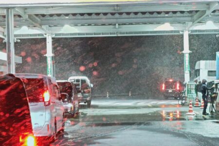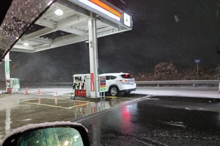 スタッドレスタイヤなど履いていない車のため、高速道路で大往生するor土山SAで車中泊するかの選択を迫られる。