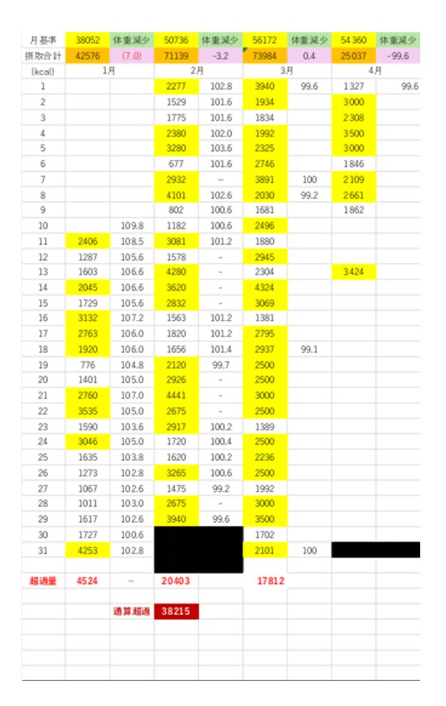 ▲黄色はカロリーオーバーの日(3/31時点で38215カロリーオーバーの大記録♪)